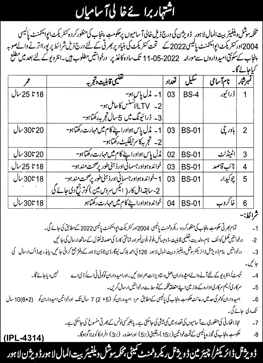 Social Welfare & Bait ul Maal jobs advertisement dated about 22 April 2022 in daily Nawaiwaqt Newspaper invites application for the vacant post of attendant, chowkidar, khakrob, bawarchi, naib qasid and driver in Lahore, lahore Punjab Pakistan. Candidates with Middle and Primary etc. educational background will be preferred.