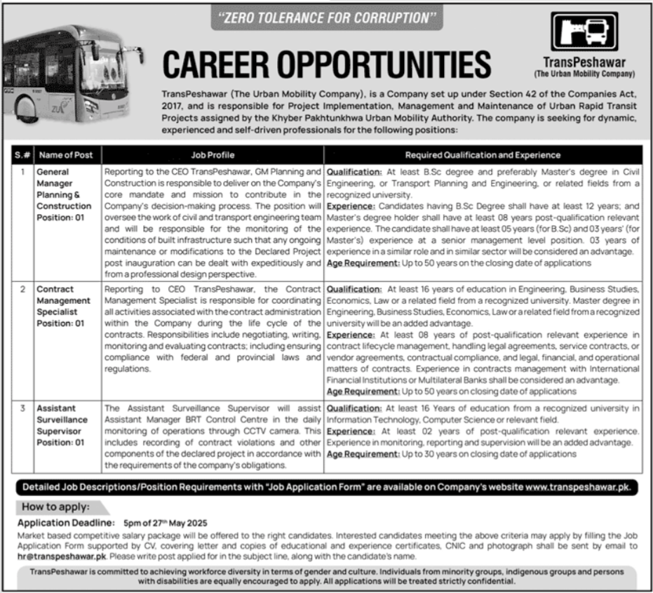TransPeshawar invites applications for job positions advertised in daily Jang dated 13 May 2025 for following vacancies in GT Road Peshawar, peshawar Khyber Pakhtunkhwa KPK Pakistan.