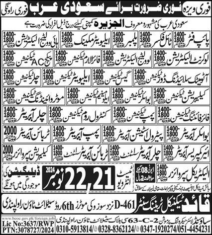 Vacant posts including motor winding technician, elevator mechanic, aluminum technician, gas technician, fire fighting technician, chiller technician, pipe fitter, pump technician, electrical supervisor, petrol station operator, control room technician, calibration supervisor, high voltage electrician, fire alarm technician, plumber, chiller operator assistant, air compressor operator, package ac technician, automatic technician, tile fixer, boiler technician, elevator technician, chiller operator, pump operator, turbine operator assistant, automatic sliding door technician, boiler operator, calibration technician, low voltage electrician and turbine operator are announced in Quaid Technical Training Center Jeddah, dammam Saudi Arabia as per 21 November 2024 advertisement in daily Express Newspaper. Educational qualifications required B.E, Matric, DAE, Intermediate and Bachelor etc.