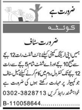 Private Company invites applications for job positions advertised in daily Express dated 28 December 2024 for following vacancies in Quetta, quetta Balochistan Pakistan.