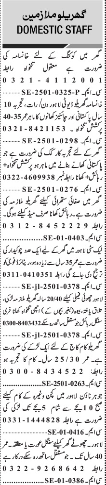 Vacant posts including house maid, khansama, house servant and cook are announced in Private Company Lahore, lahore Punjab Pakistan as per 13 January 2025 advertisement in daily Jang Newspaper. Persons with Primary and Middle etc. education can apply.
