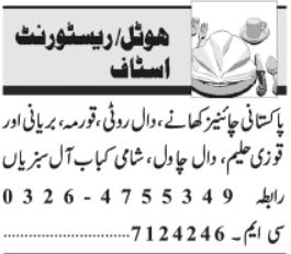 Restaurant invites applications for job positions advertised in daily Jang dated 15 October 2022 for following vacancies in Lahore, lahore Punjab Pakistan.