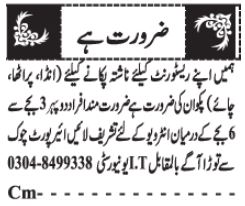 Restaurant is looking for candidates for following posts as per job advertisement published in daily Jang Newspaper of October 25, 2023 for location Quetta, quetta Balochistan Pakistan: