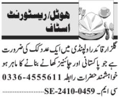 Restaurant Rawalpindi, rawalpindi Punjab Pakistan invites applications from eligible candidates for the post of chinese cook and cook as per advertisement of October 12, 2024 published in daily Jang Newspaper. Persons with Matric and Intermediate etc. education can apply.