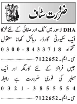 Vacant posts including sweeper, cook and helper are announced in Private Company Lahore, lahore Punjab Pakistan as per 13 September 2022 advertisement in daily Jang Newspaper. Preferred Education is Middle, Primary and Matric etc.