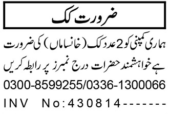 Private Company Peshawar, peshawar Khyber Pakhtunkhwa KPK Pakistan invites applications from eligible candidates for the post of khansama and cook as per advertisement of May 7, 2024 published in daily Aaj Newspaper. Persons with Middle etc. education can apply.