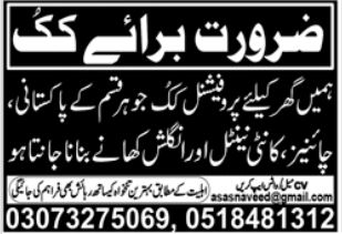 Private Company Rawalpindi, rawalpindi Punjab Pakistan invites applications from eligible candidates for the post of cook as per advertisement of December 8, 2025 published in daily Jang Newspaper. Candidates with Middle and Primary etc. educational background will be preferred.