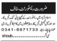 Restaurant jobs advertisement dated about 10 April 2025 in daily Khabrain Newspaper invites application for the vacant post of cook and waiter in Islamabad, islamabad Islamabad Pakistan. Educational qualifications required Middle and Matric etc.