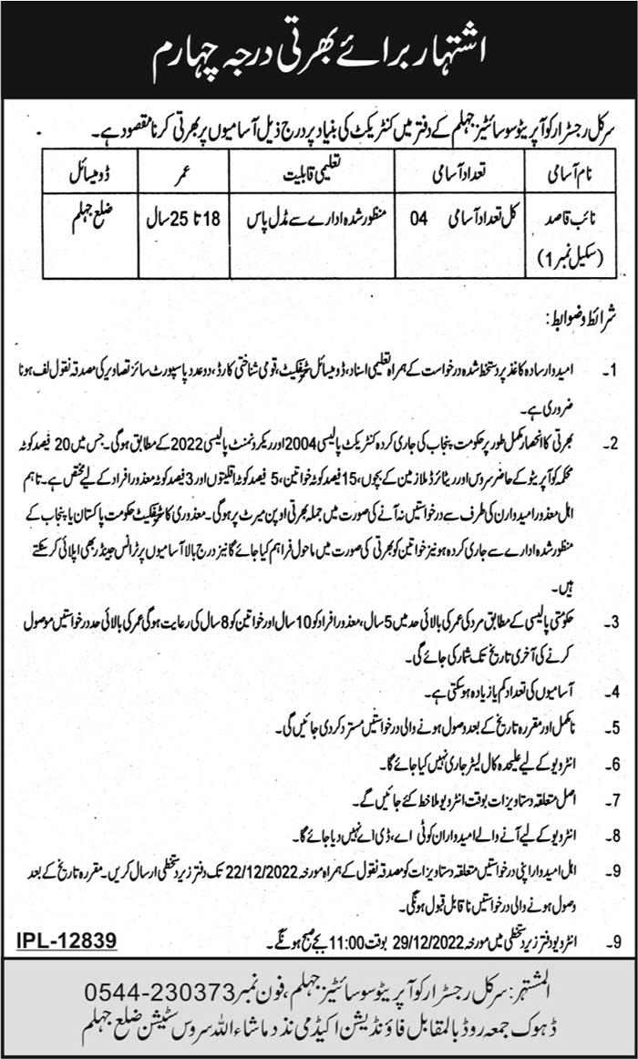 Cooperative Societies Jhelum, jhelum Punjab Pakistan invites applications from eligible candidates for the post of naib qasid as per advertisement of December 14, 2022 published in daily Roznama 92 News Newspaper. Candidates with Middle etc. educational background will be preferred.