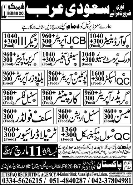 Ittefaq Recruiting Agency jobs advertisement dated about 4 March 2023 in daily Express Newspaper invites application for the vacant post of steel fixer, poclain operator, greeder operator, work permit receiver, bulldozer operator, crane operator, traila driver, jcb operator, qc inspector, rigger, safety officer, steel irrasion, scaffolder, mason, carpainter, coordinator and qc civil mechanical in Riyadh, riyadh Saudi Arabia. Persons with Intermediate, Matric, Middle and Bachelor etc. education can apply.