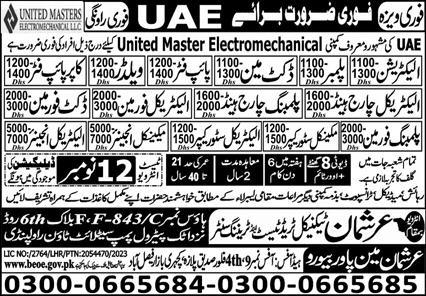 Arshman Technical Trade Test & Training Center is looking for candidates for following posts as per job advertisement published in daily Express Newspaper of November 7, 2023 for location Sharjah, abu dhabi UAE: