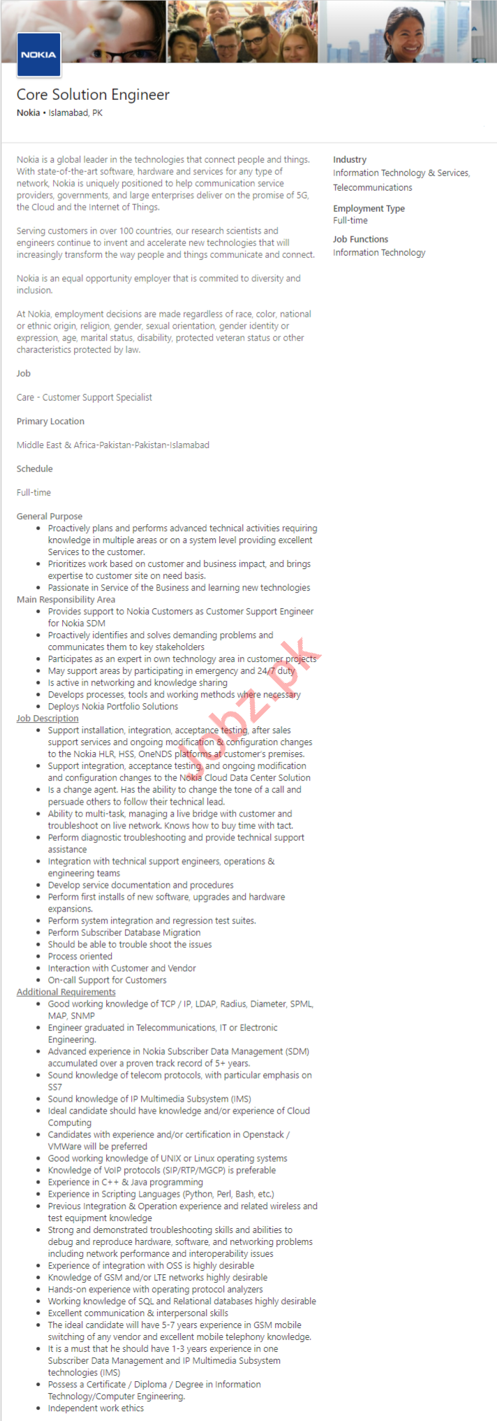 Latest Nokia Telecommunications Company Engineering Posts Islamabad 2025