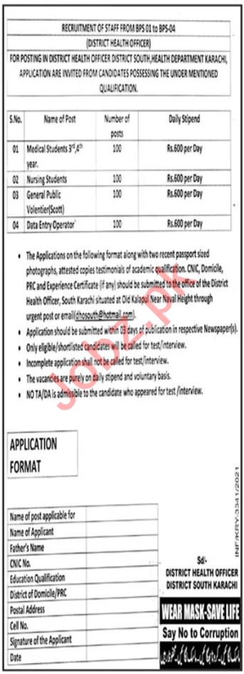 District Health Office DHO Karachi South, Health Department, Corona Vaccination Centre CVC, Government of the Sindh is seeking candidates for the posts of Medical Student, Doctor, Lady Doctor, Nurse, Nursing Student, Data Entry Operator, General Public Volunteer.