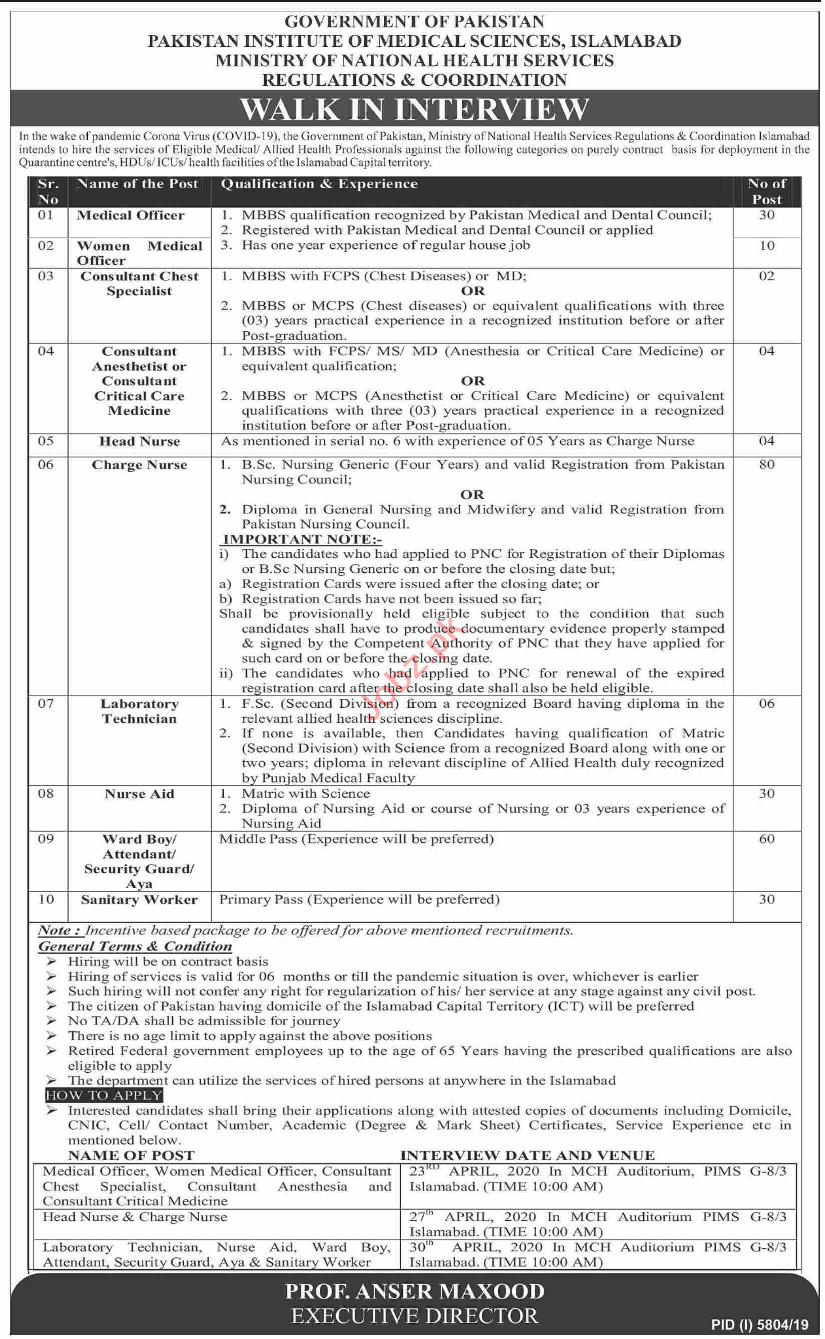 Corona Virus COVID-19, Pakistan Institute of Medical Sciences PIMS Islamabad, Health Department, Ministry of National Health Services Regulations & Coordination NHSRC, Pakistan seeks candidates for the posts of Consultant Chest Specialist, Consultant Anesthetist, Consultant Critical Care Medicine, Head Nurse, Charge Nurse, Nurse, Laboratory Technician, Technician, Nurse Aid, Ward Boy, Attendant, Security Guard, Aya, Sanitary Worker, Sweeper, Medical Officer, Woman Medical Officer, Doctor, Lady Doctor.