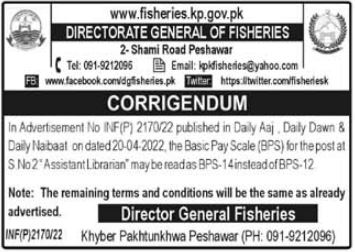 Directorate General of Fisheries Peshawar, peshawar Khyber Pakhtunkhwa KPK Pakistan invites applications from eligible candidates for the post of fisheries watcher, head fisheries watcher, assistant librarian, computer operator and assistant warden fisheries as per advertisement of April 26, 2022 published in daily Aaj Newspaper. Preferred Education is Bachelor, BCS, Intermediate, BIT and Matric etc.