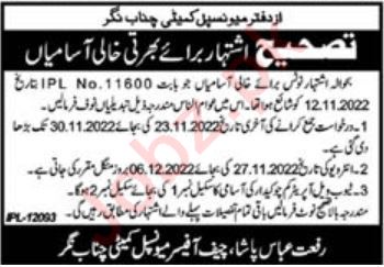 Vacant posts including tubewell operator cum chowkidar are announced in Municipal Committee Chiniot, chiniot Punjab Pakistan as per 20 November 2022 advertisement in daily Khabrain Newspaper. Persons with Middle etc. education can apply.