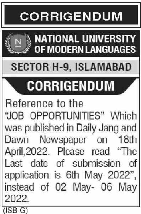 Corrigendum For Jobs Submission Date At NUML Islamabad