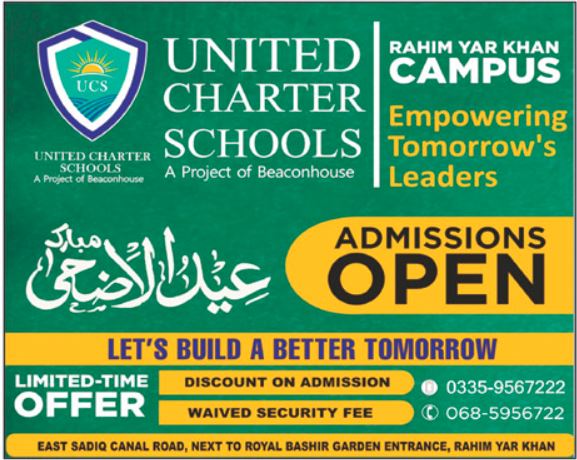 United Charter Schools admissions 2025 for Coruses Admissions has been announced. Eligible students can apply for academic admissions 2025 in United Charter Schools Rahim Yar Khan Punjab Pakistan for Medical School. Students who want to enroll for academic session 2025 in qualification and admission criteria for Government institute can apply till last date. Read newspaper ad for exact details.