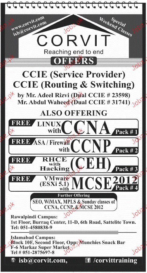 CORVIT Admission in CCNA, CCNP, CEH and MCSE in Islamabad Read newspaper ad for exact details.