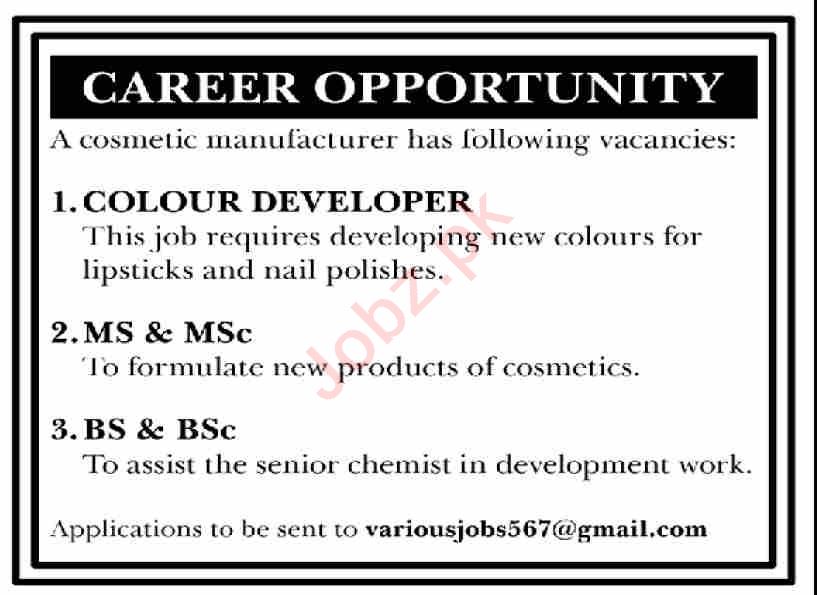 Cosmetics Manufacturing Company Karachi, karachi Sindh Pakistan invites applications from eligible candidates for the post of msc, bsc, colour developer, bs and ms as per advertisement of December 17, 2023 published in daily Dawn Newspaper. Candidates with Master, MS, M.sc and Bachelor etc. educational background will be preferred.