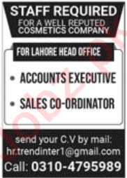 Vacant posts including accounts executive and sales coordinator are announced in Cosmetics Company Lahore, lahore Punjab Pakistan as per 26 July 2022 advertisement in daily Jang Newspaper. Educational qualifications required Master, Bachelor and Intermediate etc.