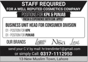 Vacant posts including business unit head are announced in Cosmetics Company Lahore, lahore Punjab Pakistan as per 15 July 2023 advertisement in daily Jang Newspaper. Preferred Education is Bachelor etc.