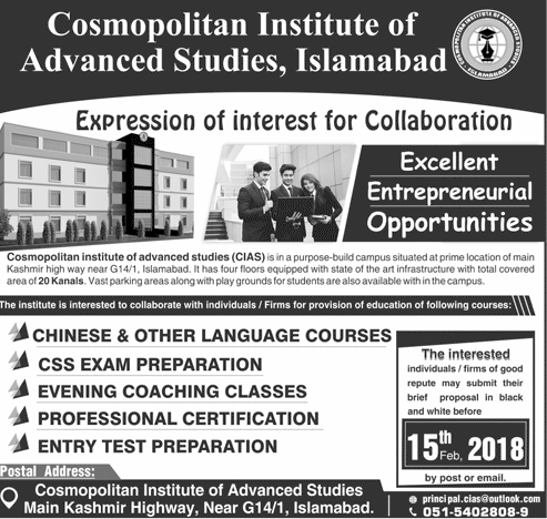 Cosmopolition Institute of Advanced Studies Admission in Courses in Chinese & Other Language Courses, CSS Exam Preparation, Evening Coaching Classes in Islamabad. Read newspaper ad for exact details.