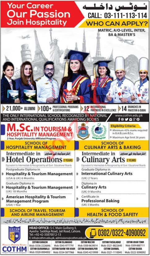 College of Tourism and Hotel Management COTHM Islamabad, Pakistan are announced admissions fall 2018 for the classes of M Sc in Tourism & Hospitality Management. Read newspaper ad for exact details.