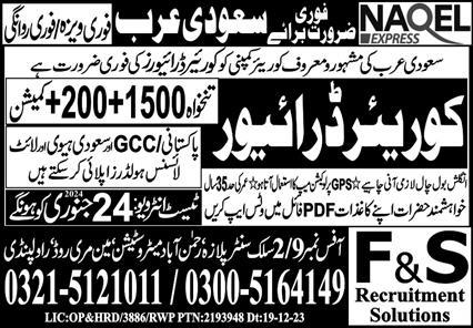 Apply at F & S Recruitment Solutions latest Overseas jobs in Driving and departments before closing date which is around January 24, 2024 or as per closing date in newspaper ad. Read complete ad online to know how to apply on latest F & S Recruitment Solutions job opportunities. Some jobs in F & S Recruitment Solutions may require skills like Driving, Food Delivery and Courier. Salary varies from 129000. Earn more by overtime. During job accommodation, transport and medical facility is available.