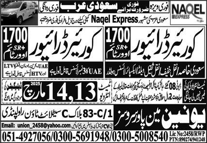 Union Manpower Services Riyadh, tabuk Saudi Arabia invites applications from eligible candidates for the post of driver and courier driver as per advertisement of March 12, 2025 published in daily Express Newspaper. Preferred Education is Matric and Intermediate etc.