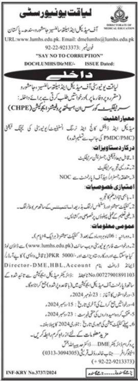 Liaquat University of Medical & Health Sciences admissions 2024 for Certificate Course in Health Professions Education CHPE has been announced. Students who want to take admissions in Liaquat University of Medical & Health Sciences Jamshoro Sindh Pakistan for academic year 2024 to continue education in Science Course can apply. Eligible candidates for admissions in Course can apply as per Government institute criteria and before closing date 15 December 2024 after reading advertisement online. Read newspaper ad for exact details.