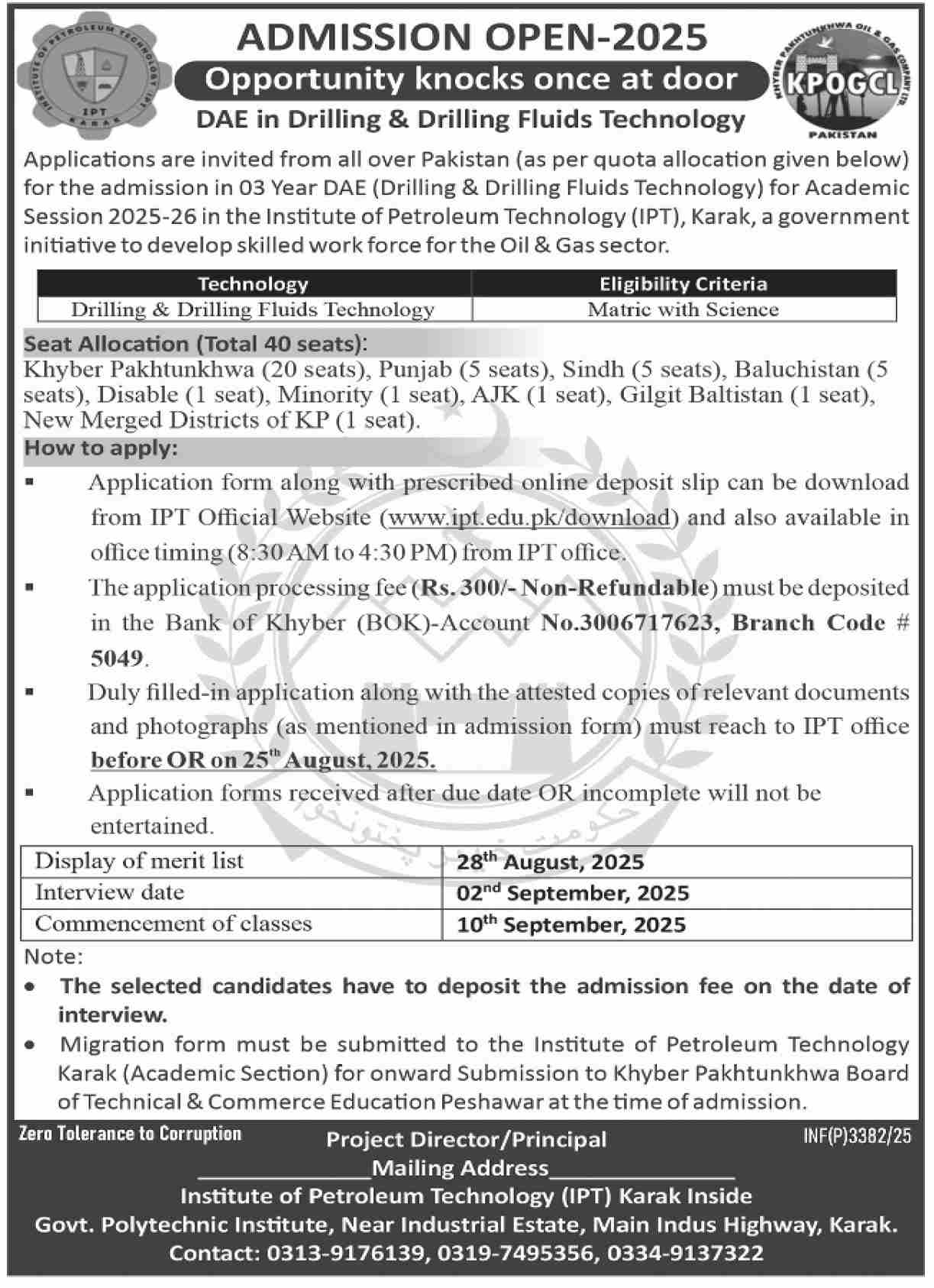 Khyber Pakhtunkhwa Oil & Gas Company Limited KPOGCL COURSES admissions 2025 has been started. Eligible students who qualify as per admission criteria in Khyber Pakhtunkhwa Oil & Gas Company Limited KPOGCL Karak Khyber Pakhtunkhwa KPK Pakistan can apply in Science University for academic year 2025. Eligible candidates for admissions in can apply as per Government institute criteria and before closing date after reading advertisement online. Read newspaper ad for exact details.
