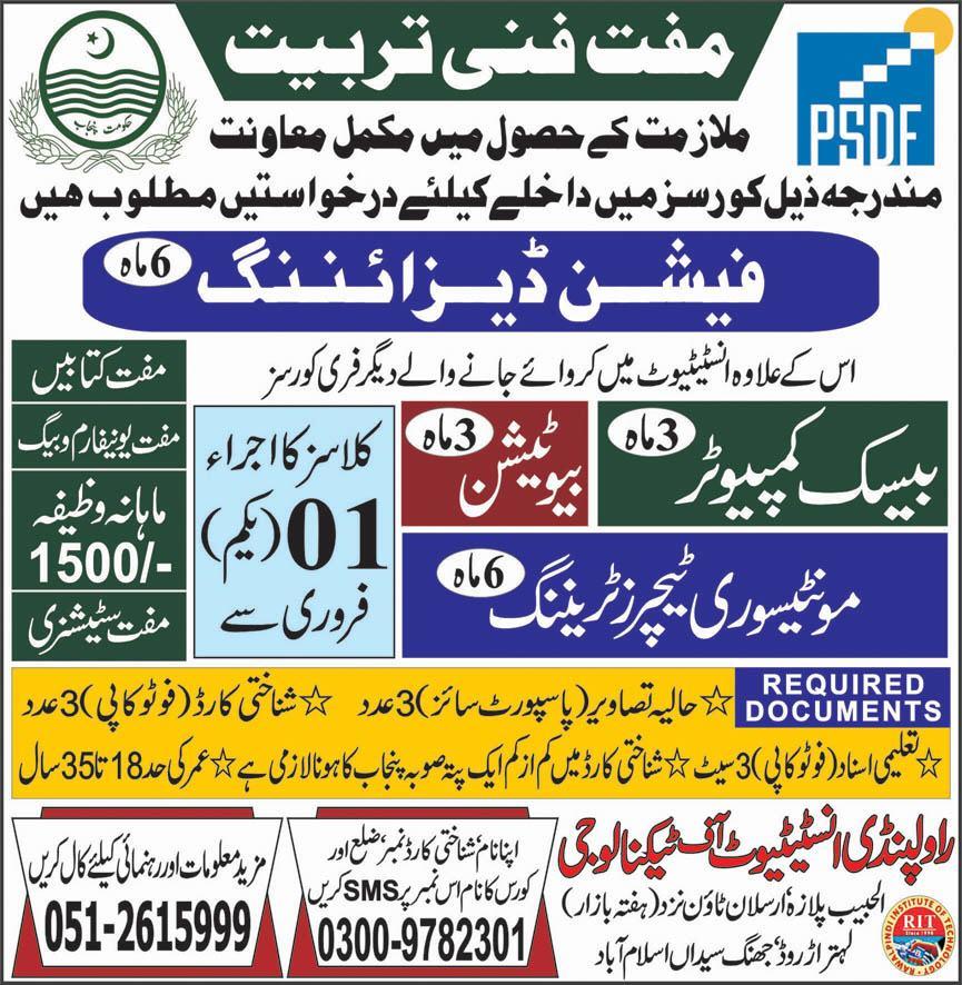 Rawalpindi Institute of Technology RIT admissions 2022 for Fashion Designing, Basic Computer, Beautician, Montessori Teachers Training has been announced. Rawalpindi Institute of Technology RIT Islamabad Islamabad Pakistan welcomes students to apply for admissions in academic year 2022 in Other College. Eligible candidates for admissions in Course can apply as per Government institute criteria and before closing date 18 February 2022 after reading advertisement online. Read newspaper ad for exact details.