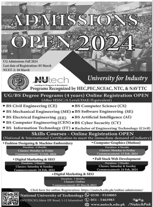 National University of Technology NUTECH has announced admissions 2024 for Courses, BS Programs. Students can enroll for admissions in National University of Technology NUTECH Islamabad Islamabad Pakistan for academic year 2024 to continue campus based or online education in Science University. Students for admissions in BS, Bachelor, B.E and Course & criteria can apply as per Government institute admission policy 2024 before closing date February 26, 2024 as per advertisement. Read newspaper ad for exact details.