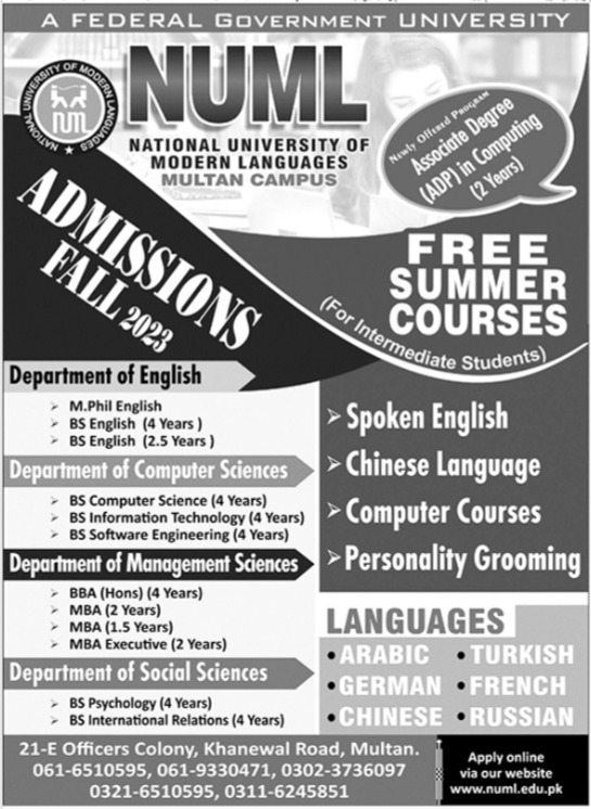 National University of Modern Languages NUML Language Courses, BS, BBA, MBA, MPhil admissions 2023 has been announced. Students can enroll for admissions in National University of Modern Languages NUML Multan Punjab Pakistan for academic year 2023 to continue campus based or online education in Management University. Students who want to enroll for academic session 2023 in BIT, BBA, Course, MBA, BS, BCS and Mphil qualification and admission criteria for Government institute can apply till last date 11 July 2023. Read newspaper ad for exact details.