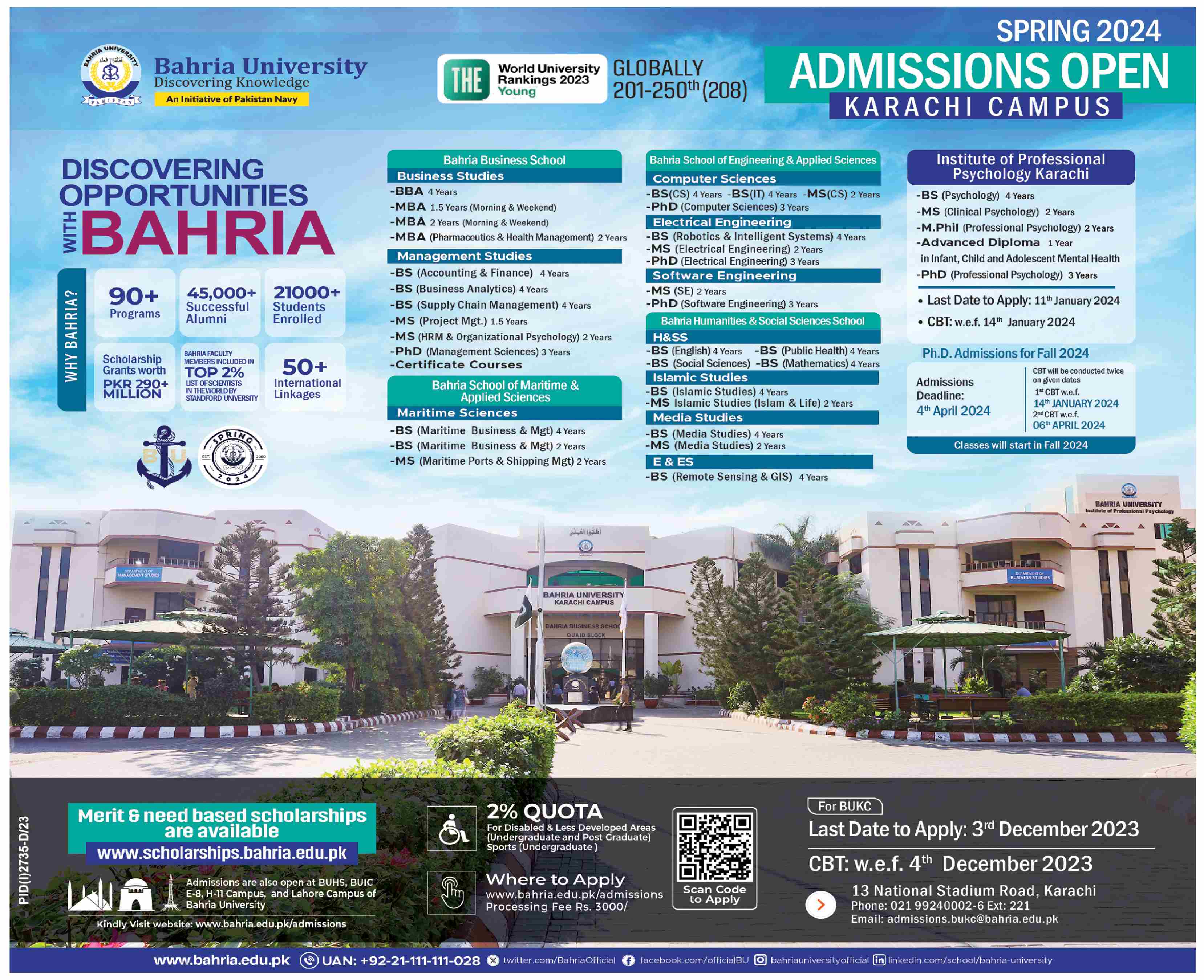 Admissions in Bahria University 2023 for Certificate Courses, BS, BBA, PhD has been announced. Eligible students can apply for academic admissions 2023 in Bahria University Karachi Sindh Pakistan for Science University. Students for admissions in BS, Course, BBA and Phd & criteria can apply as per Private institute admission policy 2023 before closing date February 5, 2024 as per advertisement. Read newspaper ad for exact details.