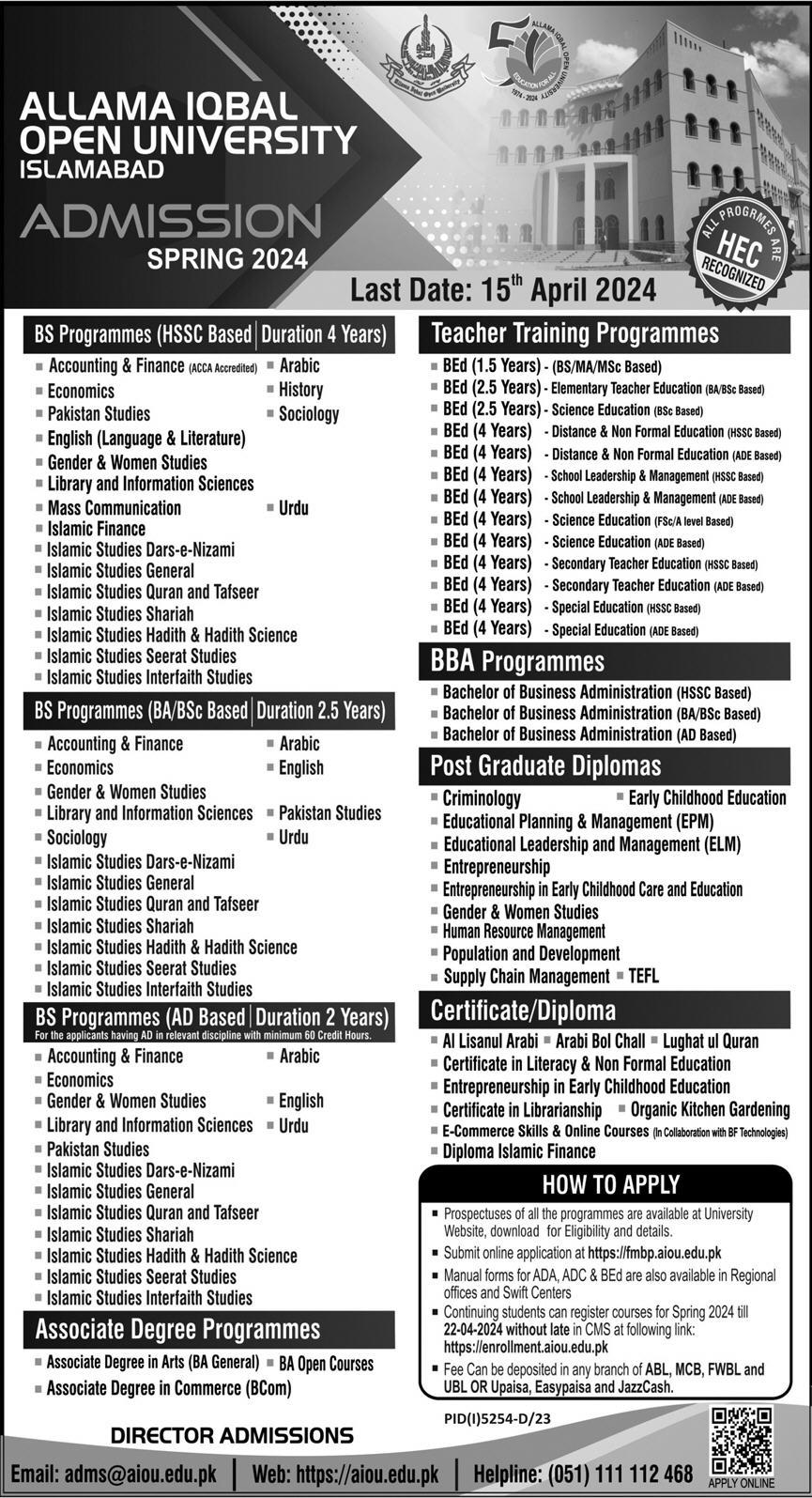Allama Iqbal Open University AIOU Course, Diploma, ADP, PG Diploma, BS, B.Ed admissions 2024 has been announced. Eligible students who qualify as per admission criteria in Allama Iqbal Open University AIOU Islamabad Islamabad Pakistan can apply in Science University for academic year 2024. Students for admissions in B.ed, Course, ADP, Diploma and BS can apply for online or campus classes as per Government institute criteria till admission closing date April 15, 2024. Read newspaper ad for exact details.