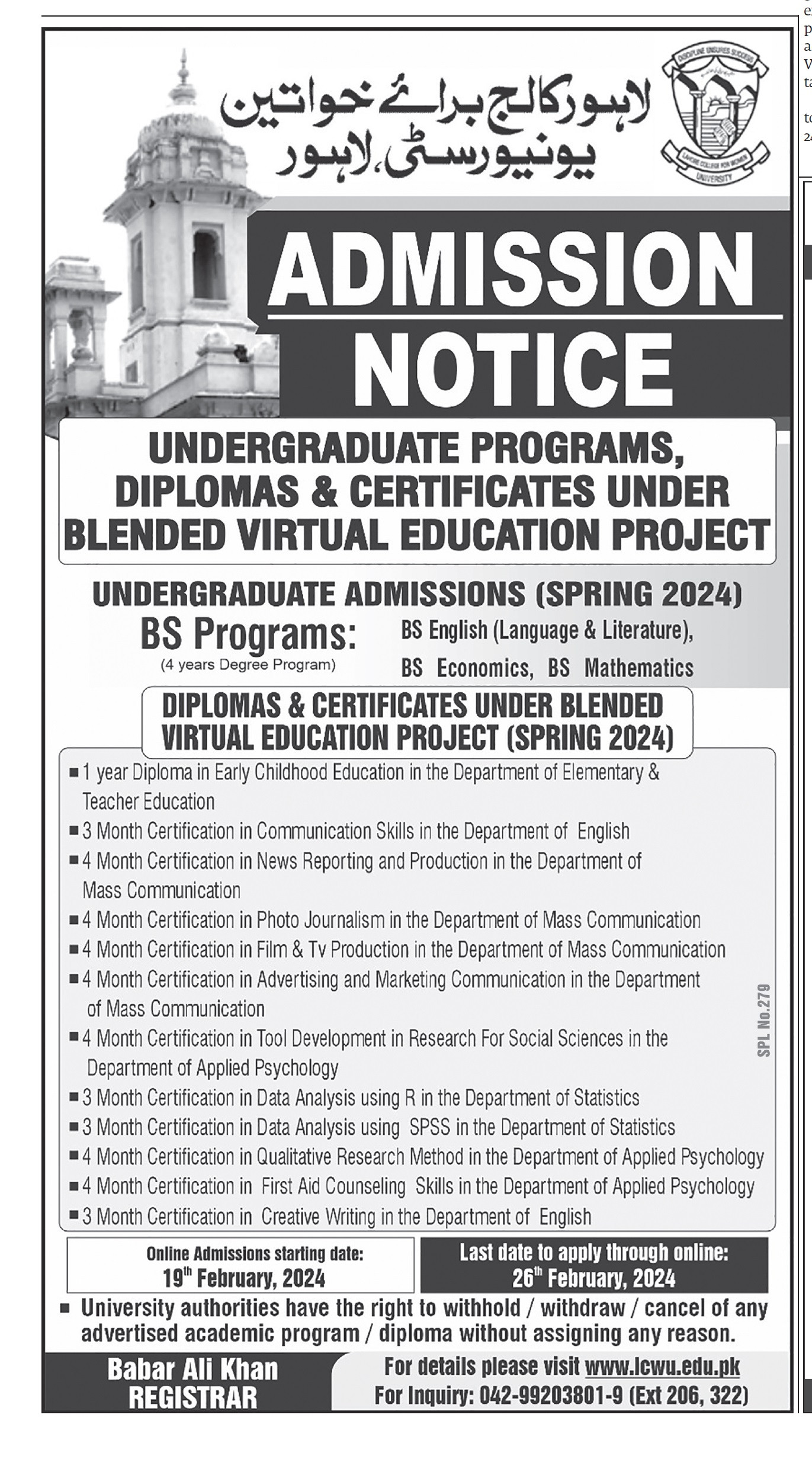Lahore College For Women University LCWU admissions 2024 for Course, Diploma, BS has been announced. Lahore College For Women University LCWU Lahore Punjab Pakistan welcomes students to apply for admissions in academic year 2024 in Science University. Eligible candidates for admissions in BS, Course and Diploma can apply as per Government institute criteria and before closing date 26 February 2024 after reading advertisement online. Read newspaper ad for exact details.