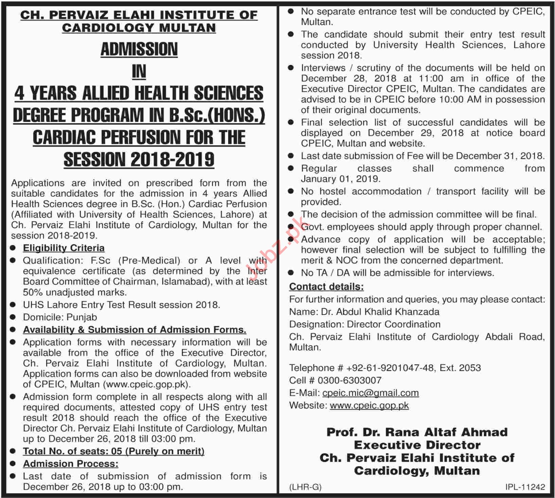 CPEIC Chaudhry Pervaiz Elahi Institute of Cardiology Multan, Pakistan are started admissions 2018 to 2019 for the classes of B Sc Hons Cardiac Perfusion, 4 Years Degree Program. Read newspaper ad for exact details.