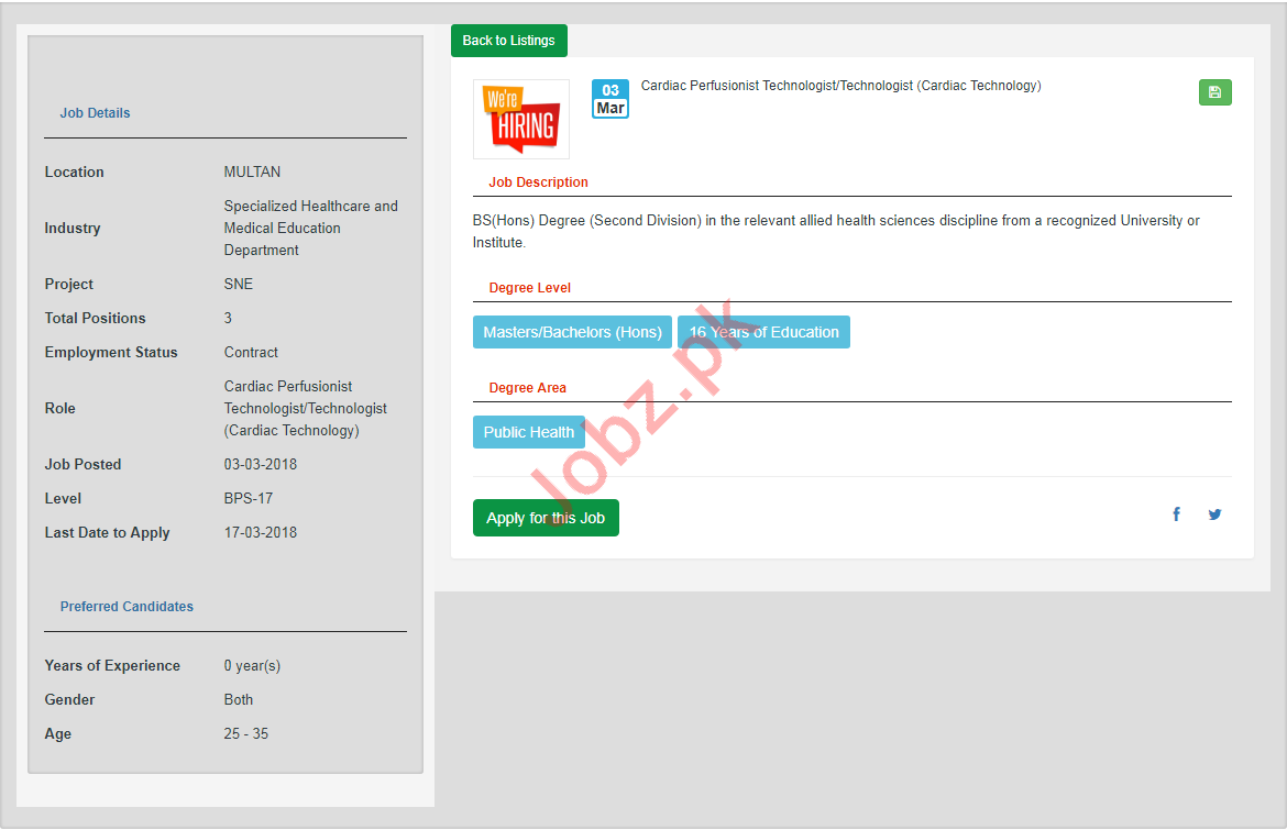 Apply as per details in job advertisement. Login to view further details of how to apply via https://www.jobz.pk online.