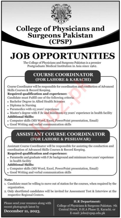 College of Physician and Surgeons Pakistan CPSP Islamabad, peshawar, lahore, karachi and islamabad Islamabad Pakistan invites applications from eligible candidates for the post of course coordinator and assistant course coordinator as per advertisement of November 26, 2023 published in daily Jang Newspaper. Educational qualifications required Bachelor, Master and Others etc.