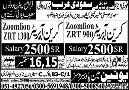 Vacant posts including zoomlion zrk crane operator and crane operator are announced in MS Union Manpower Services OEP Jeddah, jeddah Saudi Arabia as per 15 September 2025 advertisement in daily Express Newspaper. Persons with Intermediate and Matric etc. education can apply.