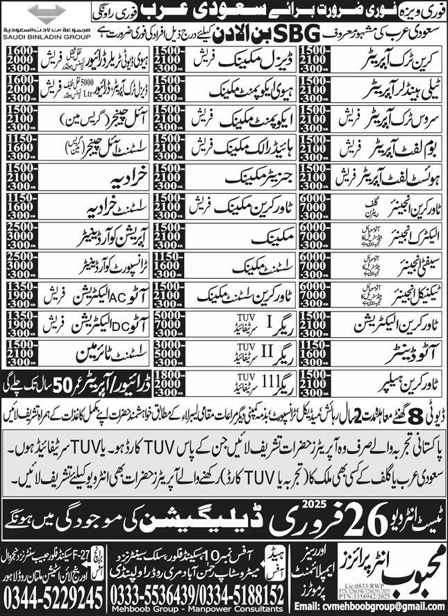 Mehboob Enterprises Overseas Employment Promoters jobs advertisement dated about 21 February 2025 in daily Express Newspaper invites application for the vacant post of boom truck operator, shawl operator, data entry operator, assistant tyre man, assistant mechanic, tower crane mechanic, fork lift operator, diesel truck operator, computer operator, roller operator, rigger, assistant oil changer, service truck operator, tower crane assistant mechanic, crane truck operatpr, main lift operator, diesel mechanic, tower crane engineer, diesel truck driver, technical engineer, auto ac electrician, heavy equipment mechanic, tower crane electrician, telehandler operator, boom truck driver, oil changer, driver, heavy duty trailer driver, operation coordinator, auto dc electrician, asphalt paver helper, light duty driver, tower crane operator, generator operator, auto denter, ltv driver, auto welder, hydraulic mechanic, transport coordinator, electric engineer, mobile crane operator, equipment mechanic, htv driver, tower crane helper, generator mechanic, bobcat operator, safety engineer, boom lift operator, auto painter, lathe machine operator, dumper driver, asphalt loader operator, tyre man and hoist lift operator in Dammam, al khobar Saudi Arabia. Candidates with DAE, B.E, Intermediate, Matric, Bachelor and BA etc. educational background will be preferred.