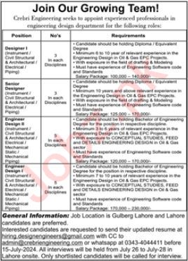 Crebri Engineering Pvt Ltd invites applications for job positions advertised in daily Jang dated 7 July 2024 for following vacancies in Lahore, lahore Punjab Pakistan.