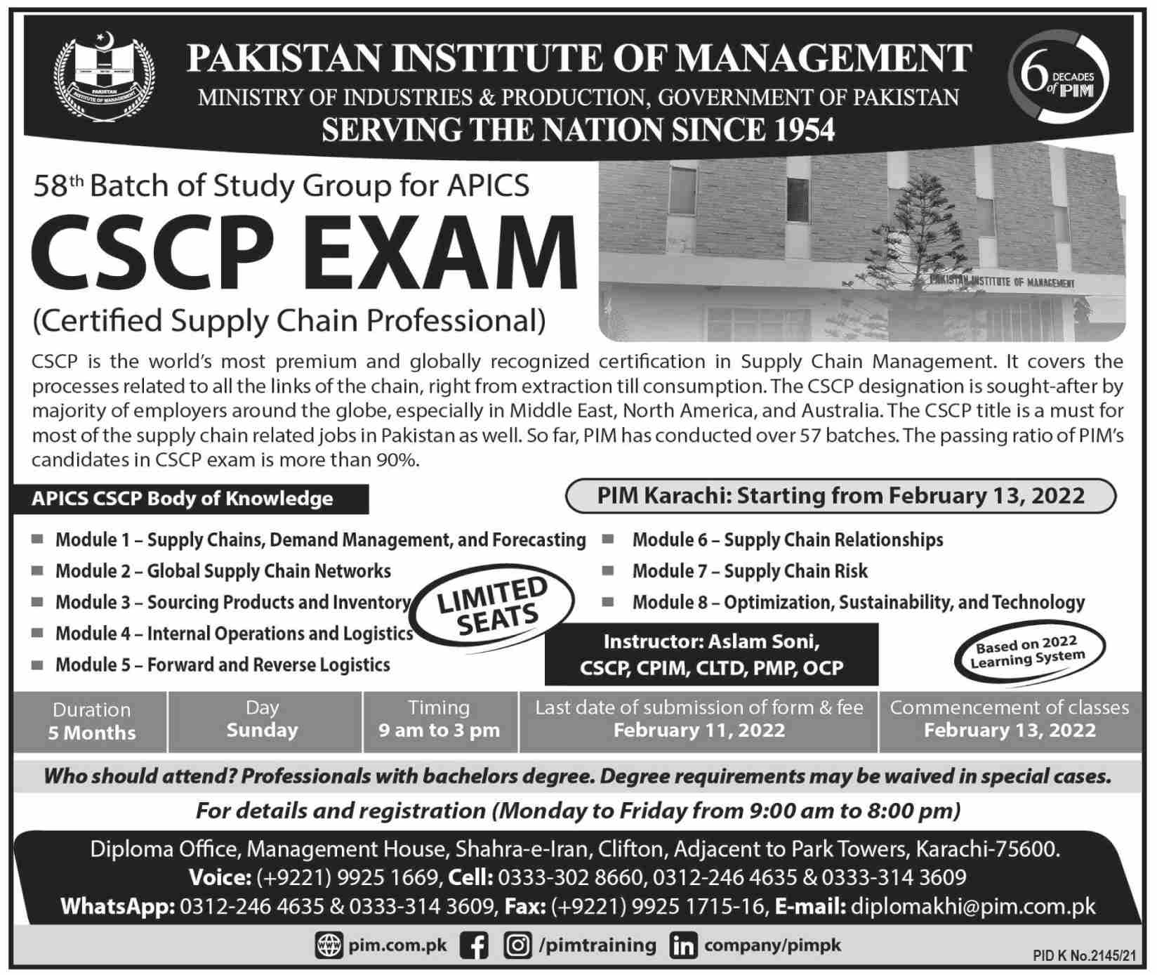 Pakistan Institute of Management has announced admissions 2022 for Certified Supply Chain Professional CSCP. Eligible students can apply for academic admissions 2022 in Pakistan Institute of Management Karachi Sindh Pakistan for Law University. Eligible students for fulfilling criteria for admissions in Course can enroll as per Government admission policy 2022 till closing date 11 February 2022. Read newspaper ad for exact details.