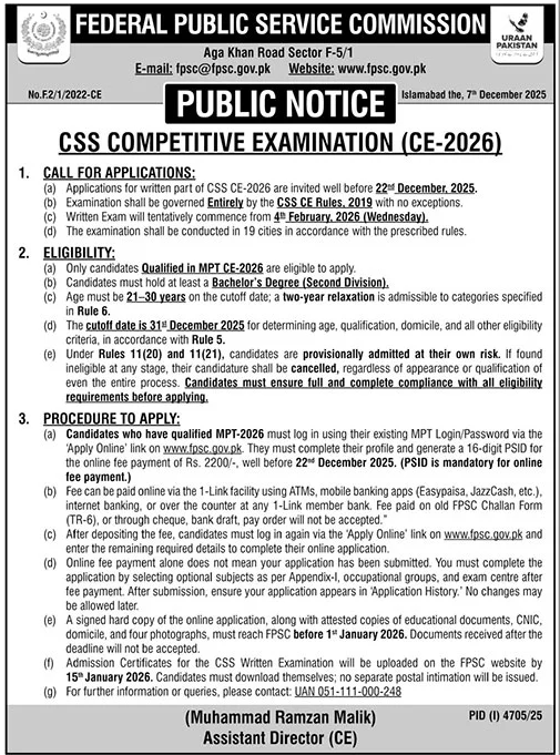 Vacant posts including css written competitive examination are announced in Federal Public Service Commission FPSC Islamabad, islamabad Islamabad Pakistan as per 7 December 2025 advertisement in daily The News Newspaper. Master and Bachelor etc. educational qualification will be preferred.