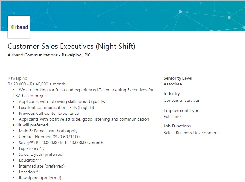 Latest Airband Communications Sales Posts Rawalpindi 2025