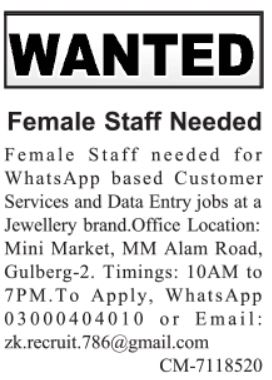 Private Company invites applications for job positions advertised in daily Jang dated 8 June 2022 for following vacancies in Lahore, lahore Punjab Pakistan.