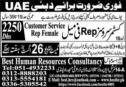Best Human Resources Consultancy latest Overseas Customer Service jobs and others can be applied till 26 August 2023 or as per closing date in newspaper ad. Read complete ad online to know how to apply on latest Best Human Resources Consultancy job opportunities. Skills in Customer Support and Public Relations may be preferred for these Best Human Resources Consultancy jobs. Salary varies from 183000. Earn more by overtime. On job medical, accommodation and transport facility is provided.