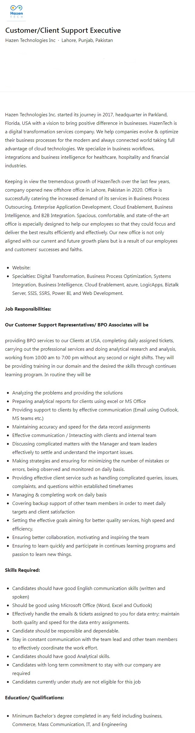 Original Source: https://pk.linkedin.com/jobs/view/customer-client-support-executive-at-hazen-technologies-inc-3423253709?refId=8Kf53yXEv%2Bf%2BppUYemr1RQ%3D%3D&trackingId=gFPNI%2FuWoSEaQE3dQpYq2w%3D%3D&trk=public_job